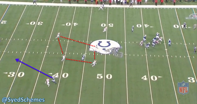 Mills can also take advantage of elite receivers as decoys from a 2-high look. Below, the Colts run Mills against the Chiefs, who are in a 2-high Cover 4 look. Speedy Wideout T.Y. Hilton is in the slot running the Dig route: