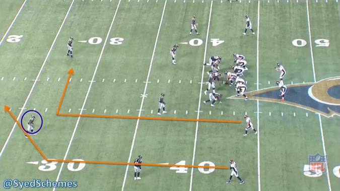 “Mills” is a pass game concept used both at the NFL and NCAA level, originally made famous by Steve Spurrier. Mills is executed with a Post route from the outside Wide Receiver and a Dig route from the slot. In today’s NFL, it is primarily used as a Cover 4 or Quarter/Quarter/Half beater and is most often seen in offenses associated with Dirk Koetter, Norv Turner, Mike McCarthy, and Peyton Manning. Mills is also sometimes referred to as the “PIN” concept (Post/In combo). This article analyzes the Mills Concept and how it can be utilized in various ways depending on personnel. Below, the 2014 Broncos run Mills against the Rams at the end of the 1st half on 3rd and 10 against a 2-deep safety look: