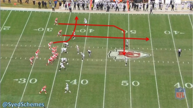 Dagger can also be run from a Trips look, with the most inside eligible receiver (often a Tight End or H-back) serving as the horizontal stretch to open up the dig. Note that here, just like the Vikings Dagger picture above, the backside receiver can run many different routes, including a curl, fade, slant, comeback, corner, or deep out. The key is still to keep the Deep 1/2 or Deep middle safety from diving to the middle of the field: