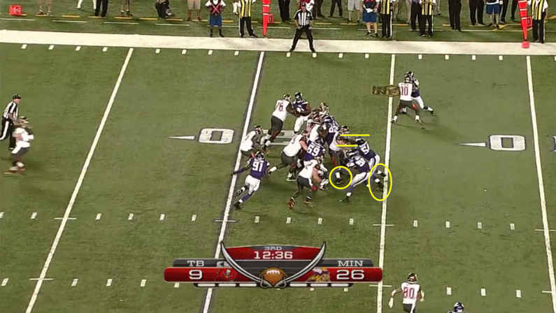 On this play, we get to see Kendricks’ biggest weakness in action: his lack of size and strength. He’s facing Ali Marpet, who the Bucs took in the same round Kendricks went. Marpet has 70 pounds on Kendricks, and it shows at the end of this play where Kendricks gets driven back. Despite that, I think Kendricks actually did a decently good job of defense on this play. The Bucs OL also did a poor job of blocking the rest of the Vikings defense, so Kendricks wasn’t particularly impactful, but he did initially start to win against Marpet and added to the massive pile of bodies that prevent James from having anywhere to run. Check out this still shot: