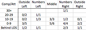 Things get worse as we move further away from the line of scrimmage and open receivers are consistently missed.
