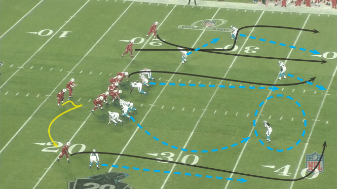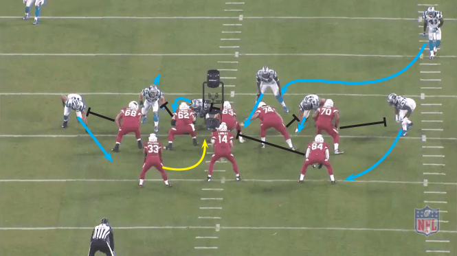 On this play it appears that the Panthers are in a “bump-man” concept. Bump man means that the defensive player is in man-to-man with the offensive player but will not motion with the player, instead the man-to-man responsibilities just pass over to the next guy. The Panthers are also bracketing the single WR, meaning the FS and the CB are guarding the WR in man-to-man coverage. The Cardinals send their outside WR in a jet motion (and probably would have been better handing it off). From the backside of the formation, the Cardinals run “Hi-Lo” drags with their WR and TE, both routes covered up by the man-to-man defense. By time the QB decides to dump the ball of to the jet, it is too late. Look at the closing speed by Davis on this play, closing the gap on one of the fastest players in the league (John Brown) and pushing him out of bounds for a gain of only 2.