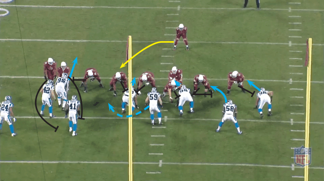 The Panthers once again come out in a Big Nickel formation (4-2-5). It’s 1st and 10 for the Cardinals, after a Panthers turnover. The Panthers are showing a B-gap blitz forcing the Cardinals to adjust their protection to the left. On the snap, the Panthers bring the blitz from the LB (Davis) and the SS from the right side, while Kuechly drops off. The NT is aligned in a “2i” technique (inside shoulder of the Guard), on the snap he outside moves to the Guard, taking the Center with him and occupying the two players. This movement leaves the backside A gap open for the LB blitz. The FB is responsible for picking up the blitz but he must be quick to get across the blitzers face. Watch how fast Davis hits the hole and blows the play up, the FB stands no chance to get his head across and seal off the blitzing LB. A perfectly timed blitz run with great execution resulting in a loss of 2.