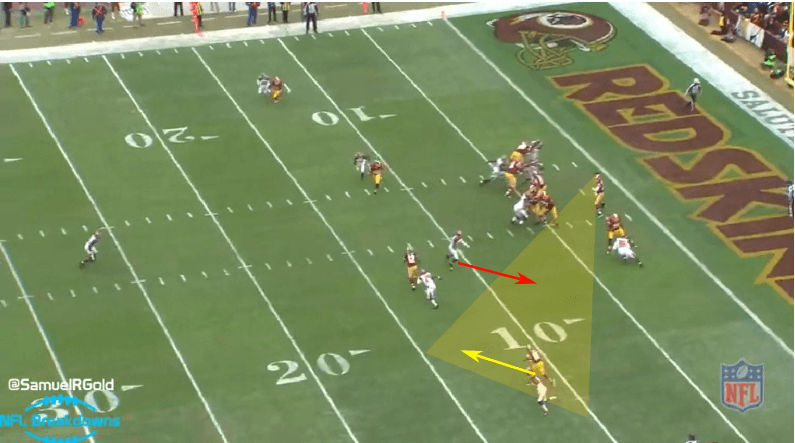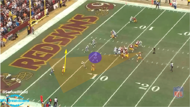 On the offensive line, watch LG Lauvao completely miss on his block on DT McDonald. You will also notice that Garcon is actually wide-open on the right side. SS Wright who was lining up in deep off-man coverage over Garcon watched RG3 double clutch and stare down Reed over the middle so he ditched his coverage to cover him. I don’t actually blame RG3 for not seeing Garcon since the LOLB was already in his face. RG3 had to escape. In this play I blame Paul for bobbling the ball, and I also blame RG3 for the low pass while Paul is open.