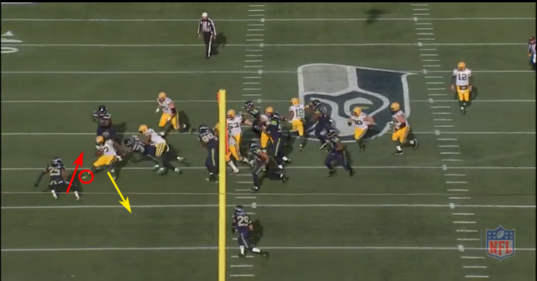 Adams’ block is the difference between a 3-4 yard run and a 7 yard run due to him sealing the edge from Sherman.