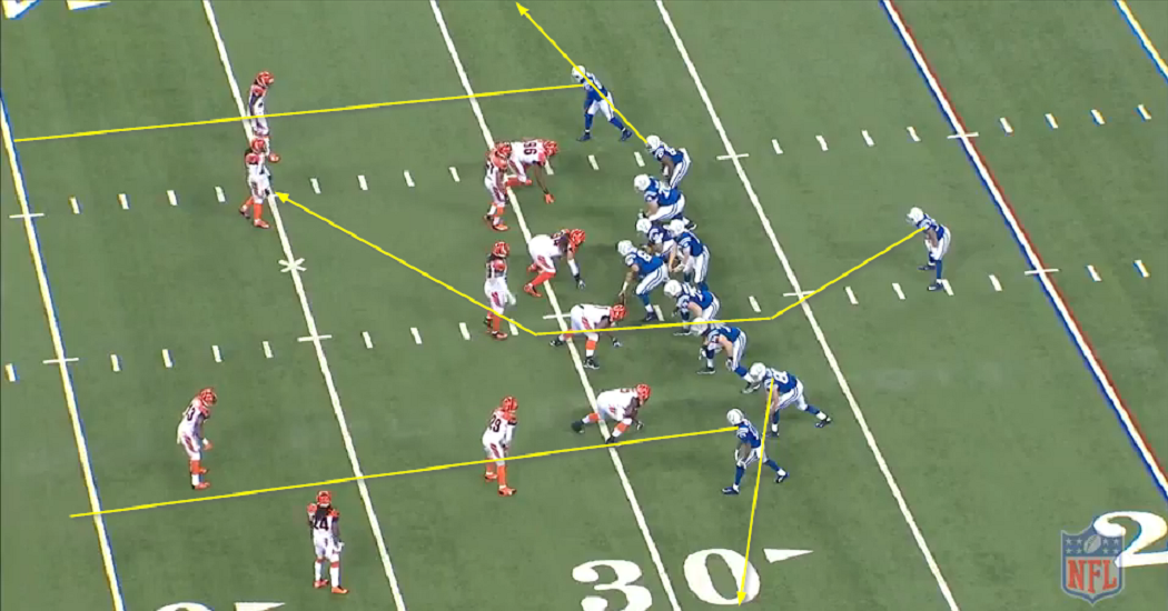 From this picture, we can see the Colts have three players (LT Costanzo, LG Mewhort, and RT Reitz) pulling to the side of the run while Fleener, Holmes, and Lance Louis all block the man in front of him. The point of this play is for Herron to get to the “edge” of the defense and then turn upfield, and that’s what happens. Because Fleener did a good job neutralizing DE Wallace Gilberry, the Bengals only have three players who could really prevent Herron from getting to the edge: Leon Hall, Adam Jones, and Rey Maualuga.