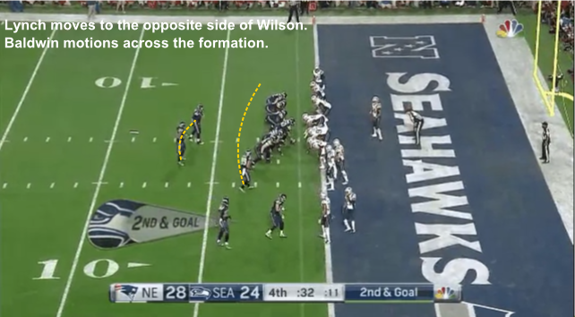Pre-snap, Wilson is in shotgun with twins stack right with Baldwin in the slot. The Patriots have Revis directly over Baldwin and Browner playing shallow on the twins right with Butler directly behind. This is a very standard defensive call against twins stack.